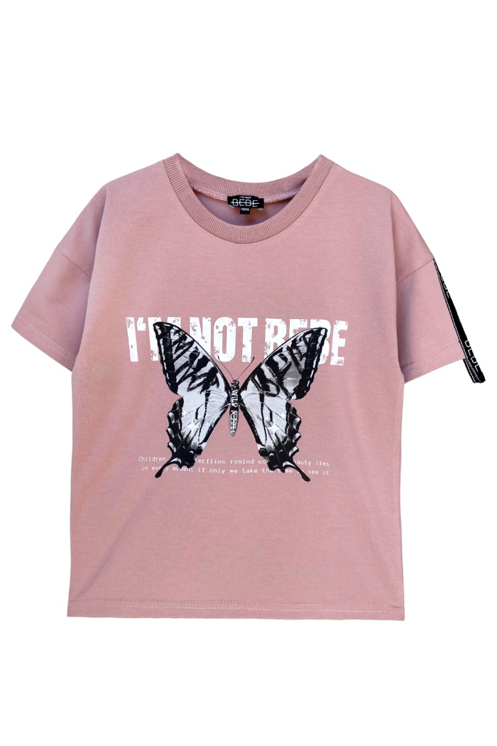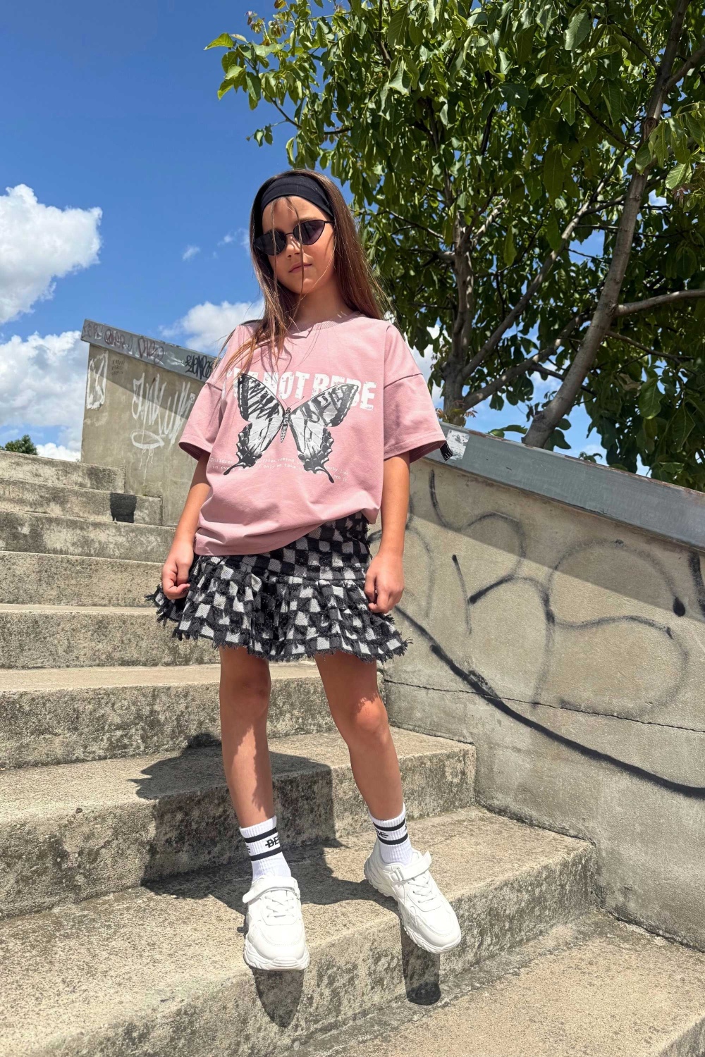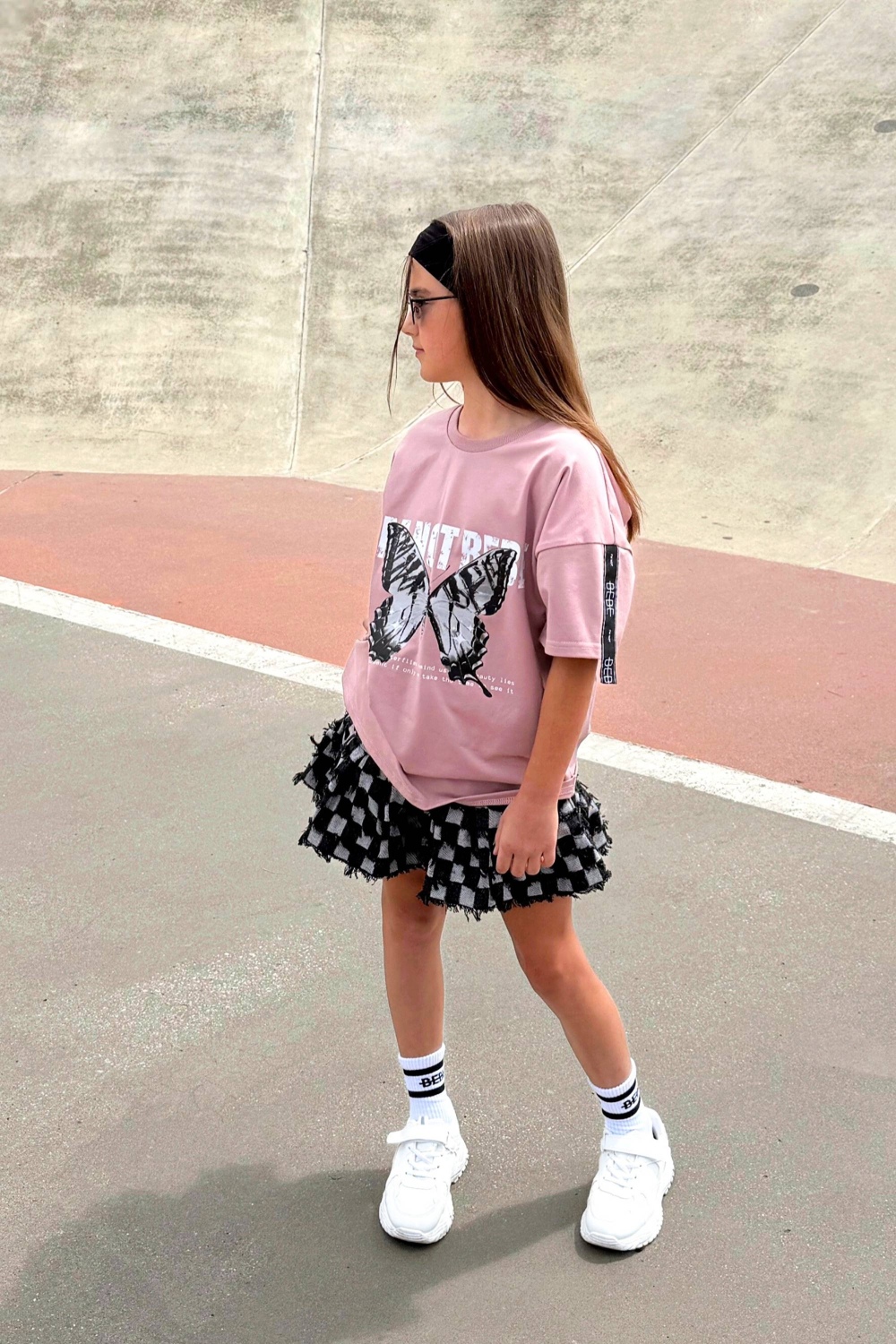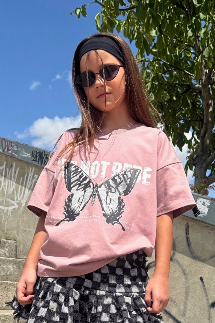 Koszulka o kroju boxy. Luźny fason zapewnia swobodę ruchów, a przepiękny brudno różowy kolor stanowi idealne tło nadruku. Duży czarno-szary motyl to zupełnie inne spojrzenie na klasyczne dziecięce wzory. Subtelnie postarzone litery nadruku dodają charakteru i surowego, miejskiego klimatu w stylu streetwear. Dodatkowym wyróżnikiem jest lampas naszyty na jednym z rękawów - subtelny detal, który podkreśli oryginalność, ale również stworzy komplet z legginsami kolarkami z naszej kolekcji.