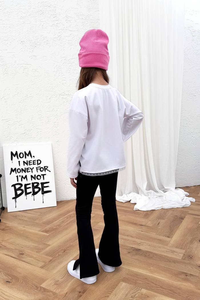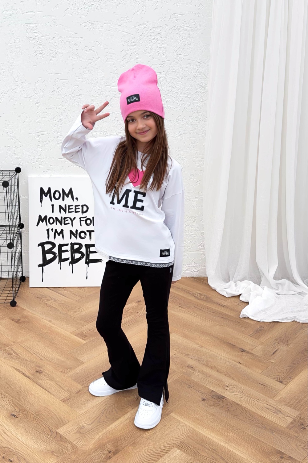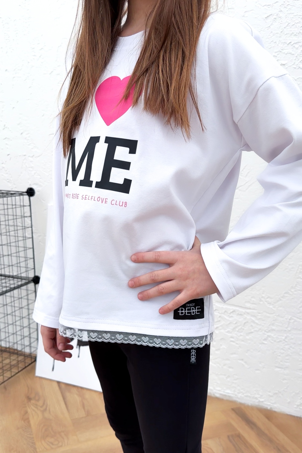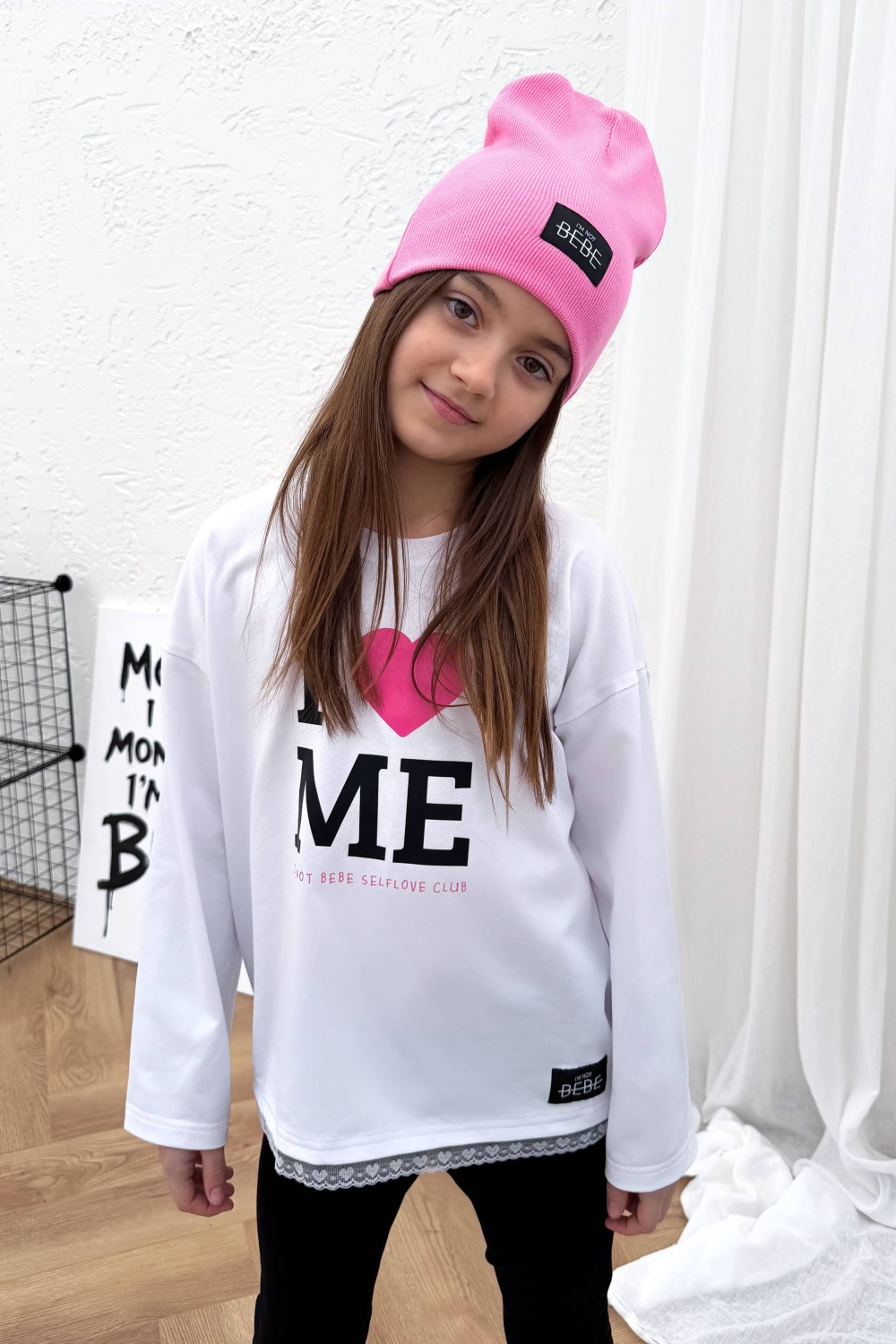 Nowoczesna, wygodna i pełna przekazu. Ta bluzka dziewczęca o kroju boxy łączy prostotę z subtelną, dziewczęcą estetyką. Luźny fason zapewnia swobodę ruchów i komfort noszenia, emocjonalny nadruk „I LOVE ME” z różowym sercem oraz hasłem „I`M NOT BEBE SELFLOVE CLUB” promuje pewność siebie i pozytywne nastawienie. Dół bluzki wykończono delikatną, białą koronką w serduszka, która dodaje lekkości i wyjątkowego designu. Całość uzupełnia duża metka z logo marki, wszyta na dole. Uszyta z wysokogatunkowej dzianiny, z certyfikatem Oeko-Tex - wolnej od szkodliwych substancji i przyjaznej dla skóry dziecka. Dzianina została dodatkowo poddana procesom, które zapobiegają mechaceniu się (na powierzchni dzianiny nie tworzą się „kuleczki/supełki”).