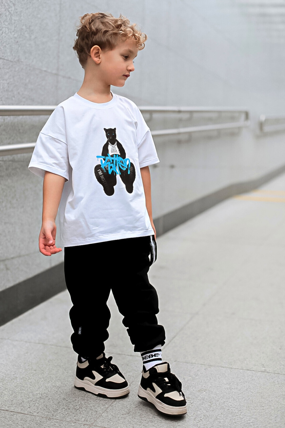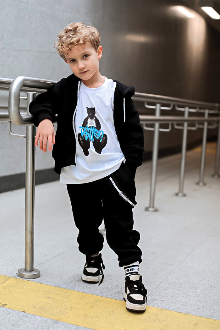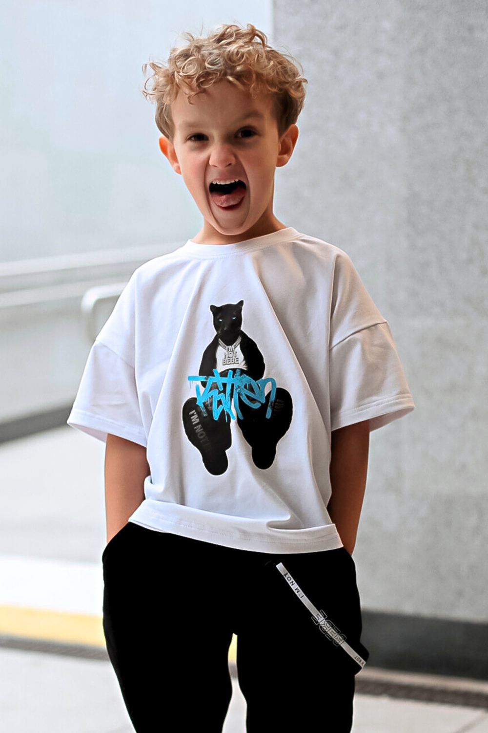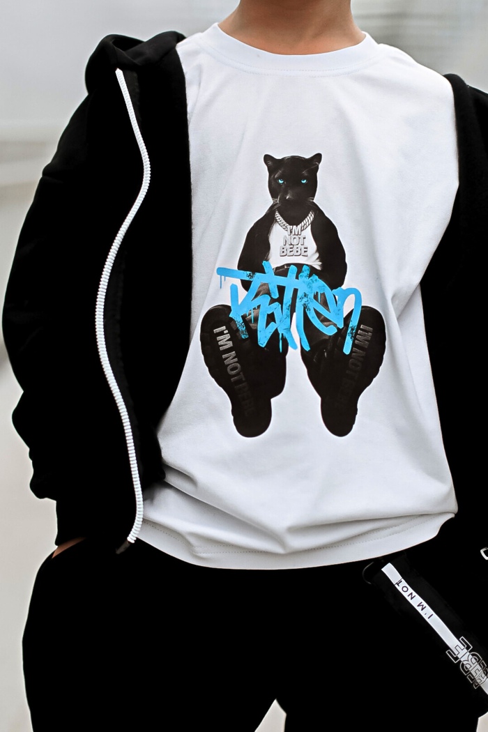 Wyrazista i pełna energii koszulka dziecięca o kroju boxy, która łączy wygodę z odważnym, modowym akcentem. Luźny fason zapewnia pełną swobodę ruchów, a duży nadruk z czarną pumą przedstawioną w dynamicznym ujęciu od dołu nadaje projektowi siłę i drapieżny charakter. Zwierzę w butach z napisem „I`M NOT BEBE” oraz łańcuchem na szyi wprowadza zabawny, przewrotny element, który podkreśla streetwearowy vibe. Centralny, błękitny napis „KITTEN” tworzy humorystyczny kontrast - idealny dla małych indywidualistów z dystansem do mody. Uszyta z wysokogatunkowej dzianiny, z certyfikatem Oeko-Tex - wolnej od szkodliwych substancji i przyjaznej dla skóry dziecka. Dzianina została dodatkowo poddana procesom, które zapobiegają mechaceniu się (na powierzchni dzianiny nie tworzą się „kuleczki/supełki”).