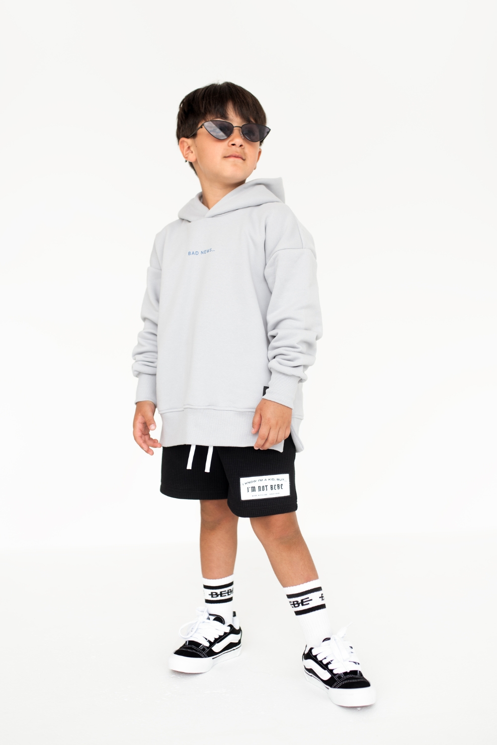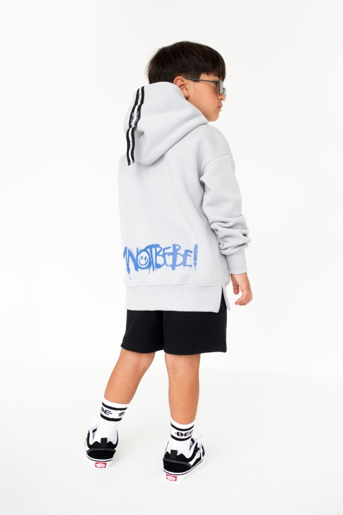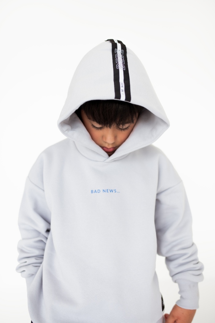 Bluza z kapturem o luźniejszym kroju. Na przodzie znajduje się nadruk „BAD NEWS...”, a z tyłu nadruk w stylu graffiti „I′M NOT BEBE!”, co nadaje młodzieżowego, buntowniczego charakteru.