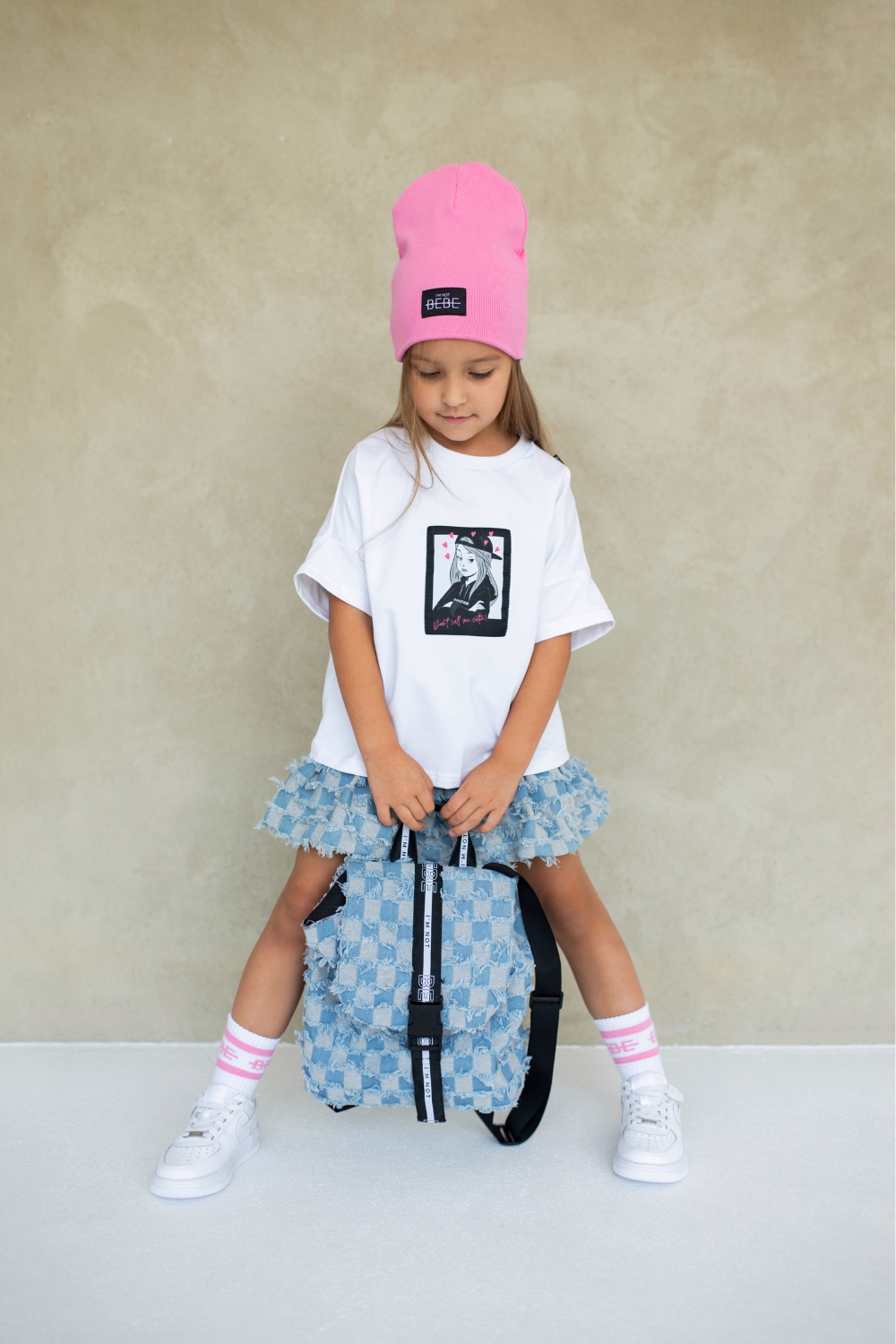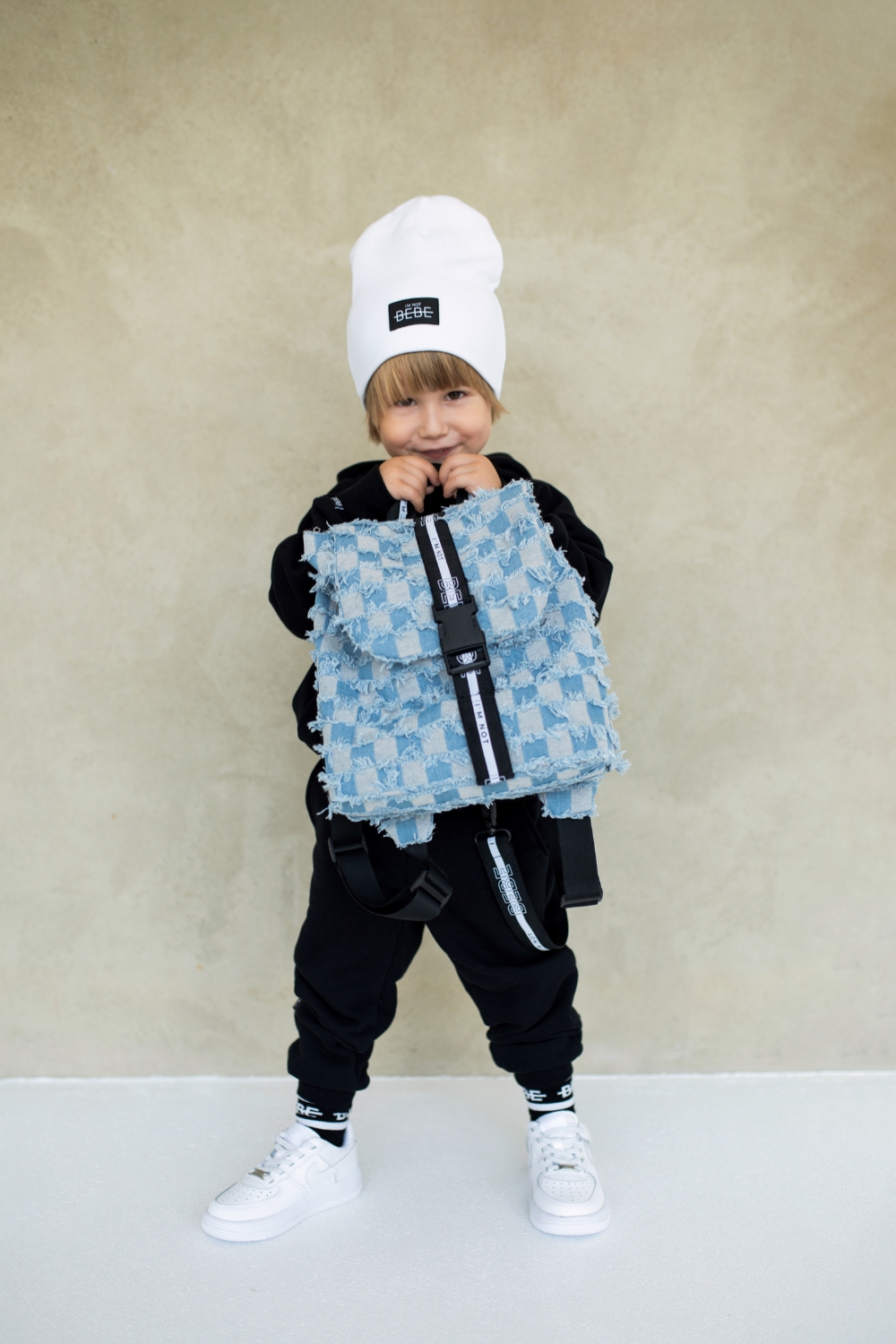Funkcjonalny plecako-worek został wykonany z efektownego, bawełnianego jeansu w szachownicę. Ozdobiony lampasami z logo marki, na przodzie oraz przy uchwycie. Całość ściągana górą gumosznurkiem ze stoperem. Klapa zapinana na czarną dużą klamrę. Plecak wyposażony jest w wygodny uchwyt do przenoszenia oraz usztywnione i wzmocnione dno. W plecaku nie zabraknie miejsca na wszystkie niezbędne akcesoria i skarby. W środku dodatkowa kieszeń na zamek pomoże w organizacji, a regulowane ramiączka zapewnią wygodę podczas noszenia.